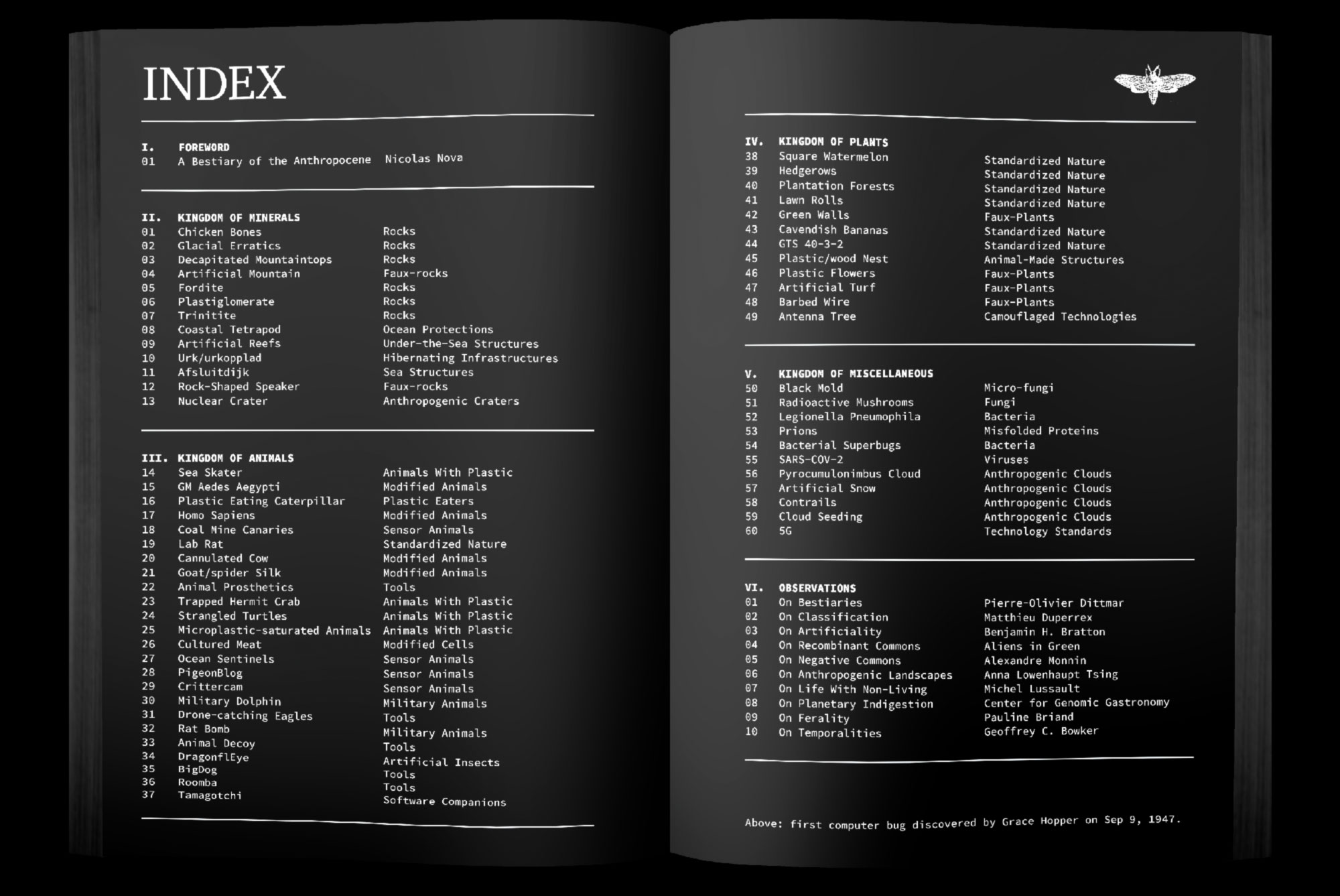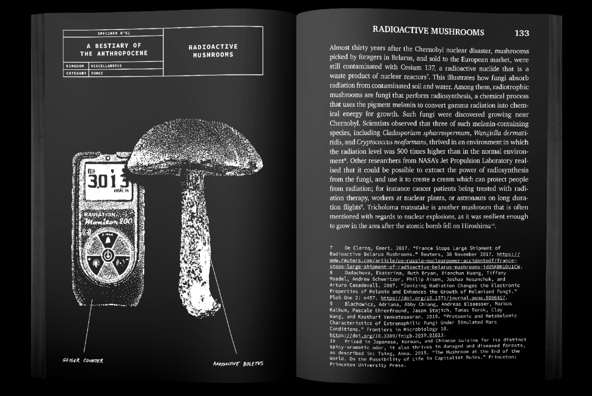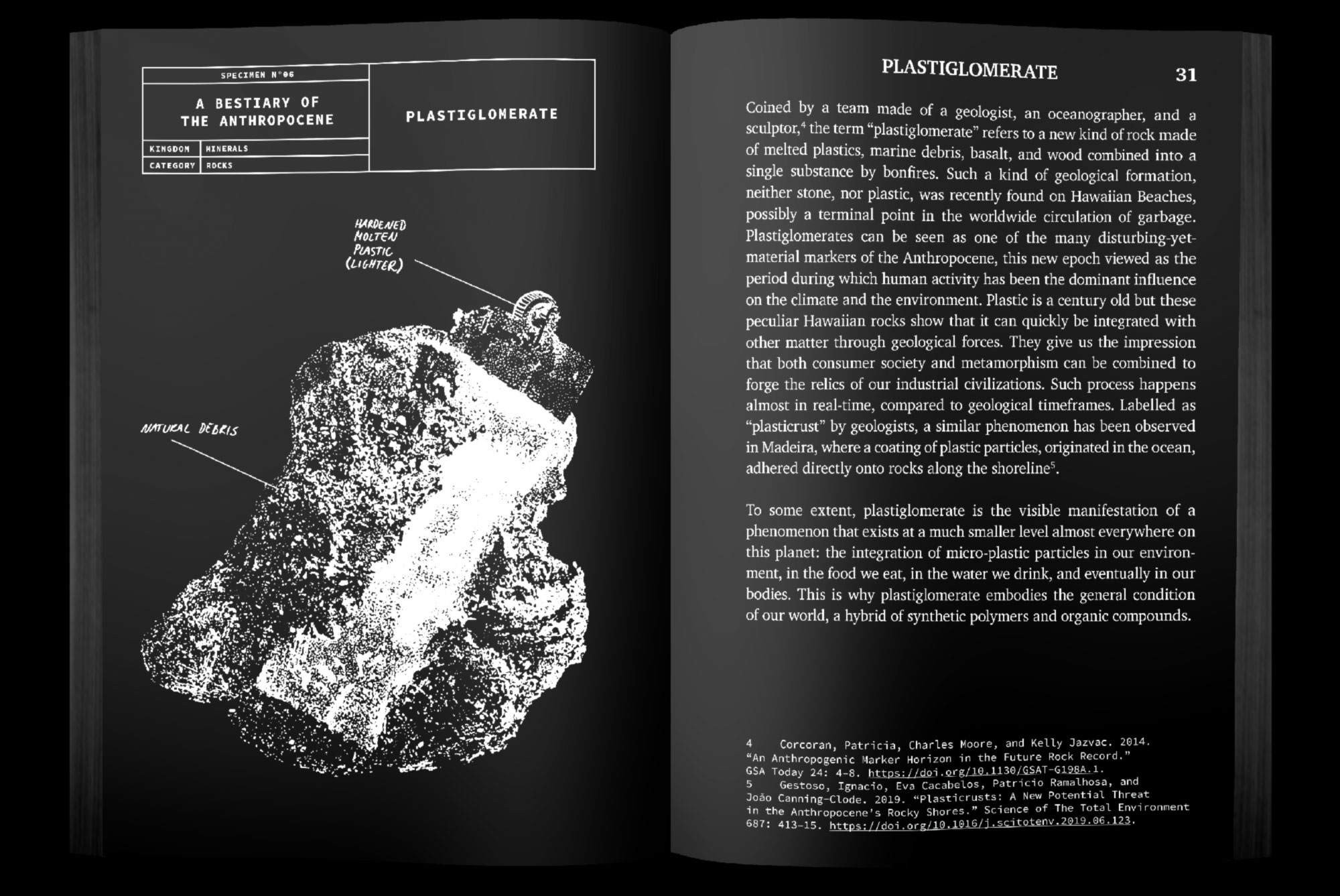 A BESTIARY OF THE ANTHROPOCENE is an illustrated compilation of hybrid creatures of our time, equally inspired by medieval bestiaries and observations of our damaged planet. Designed as a field handbook, it aims at helping us observe, navigate, and orientate into the increasingly artificial fabric of the world. Plastiglomerates, surveillance robot dogs, fordite, artificial grass, antenna trees, Sars-Covid-2, decapitated mountains, drone-fighting eagles, standardised bananas… each of these specimens are symptomatic of the rapidly transforming “post-natural” era we live in. Often without us even noticing them, these creatures exponentially spread and co-exist with us.