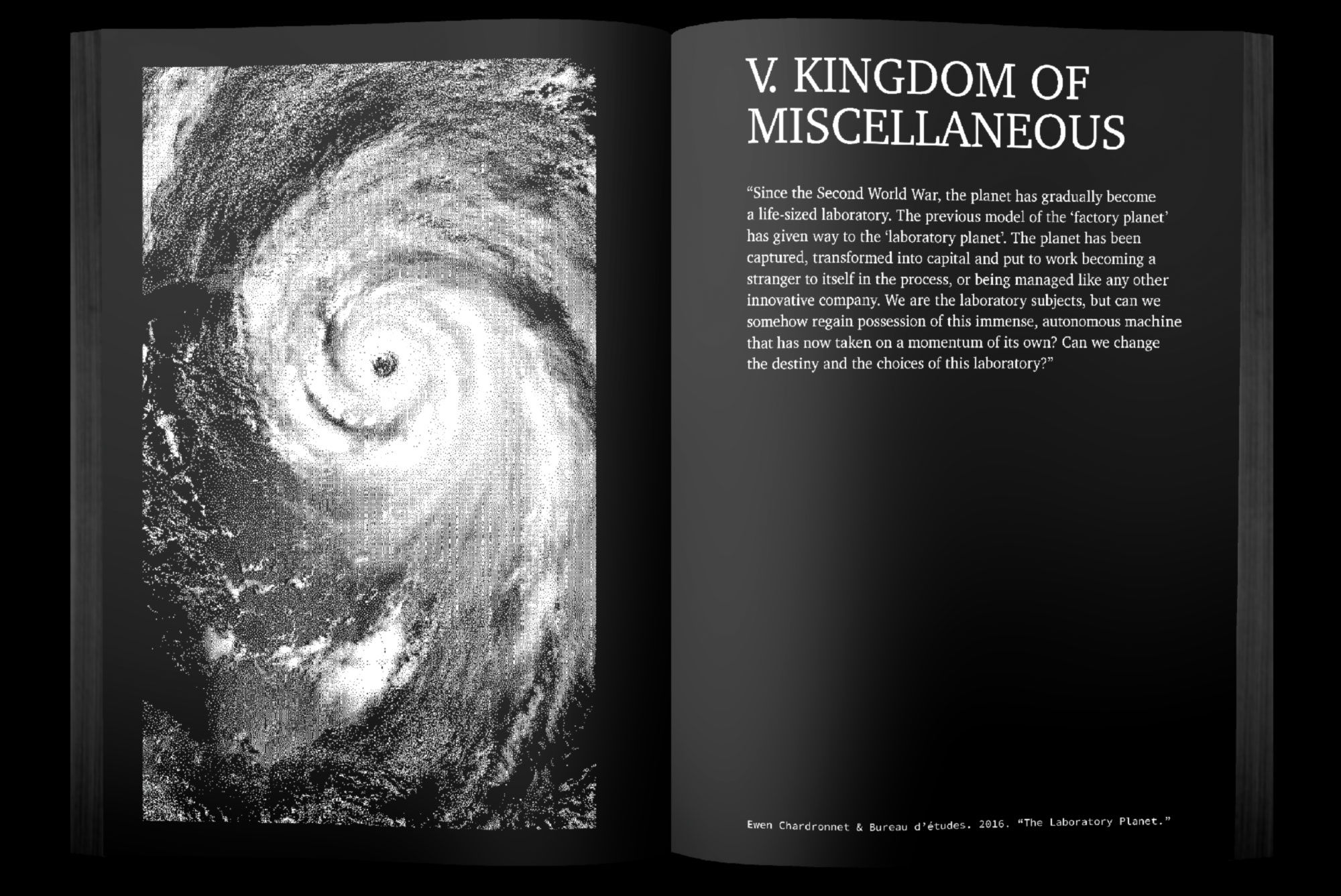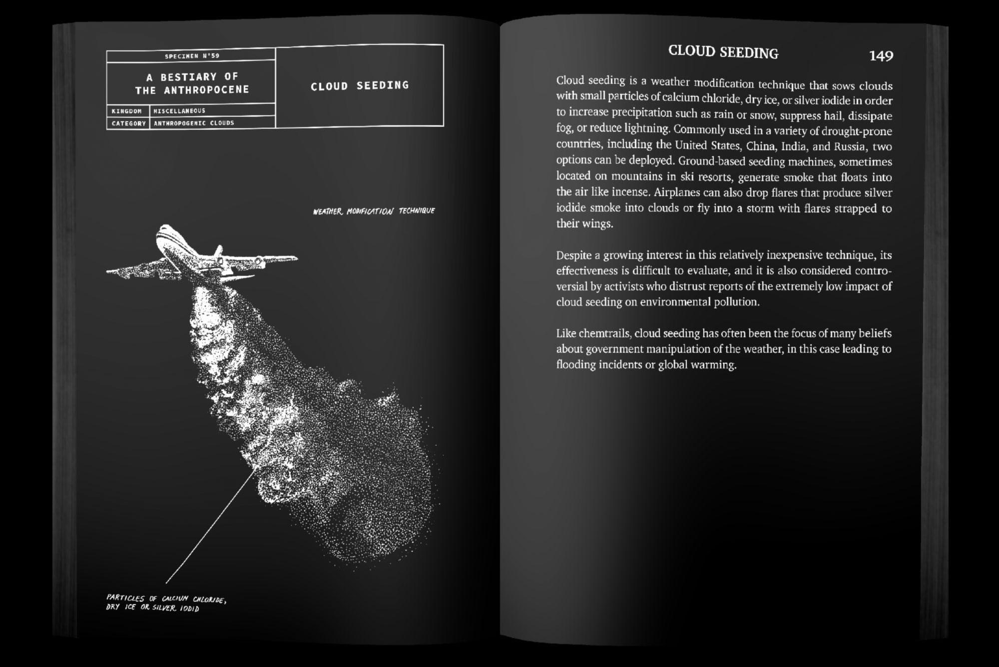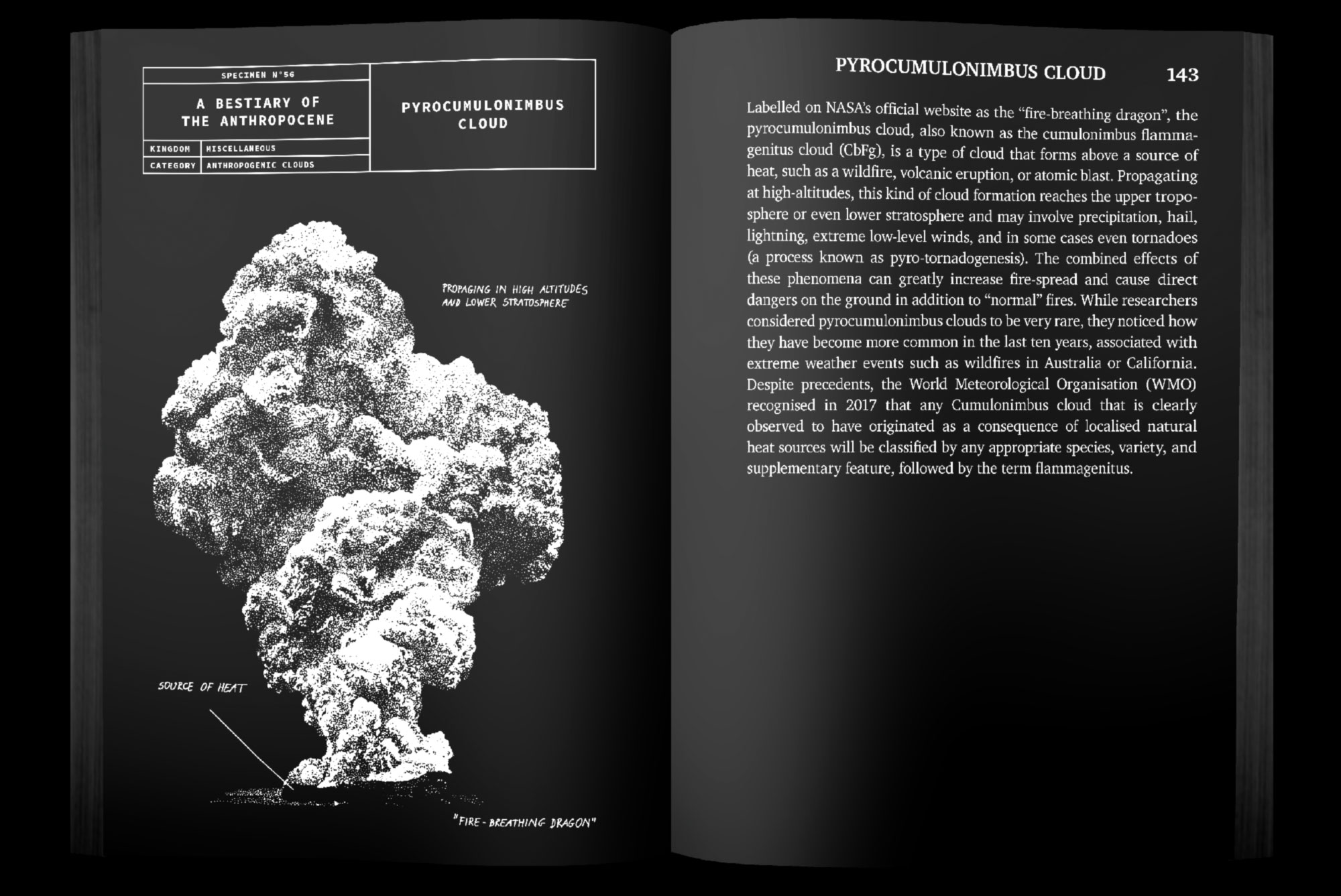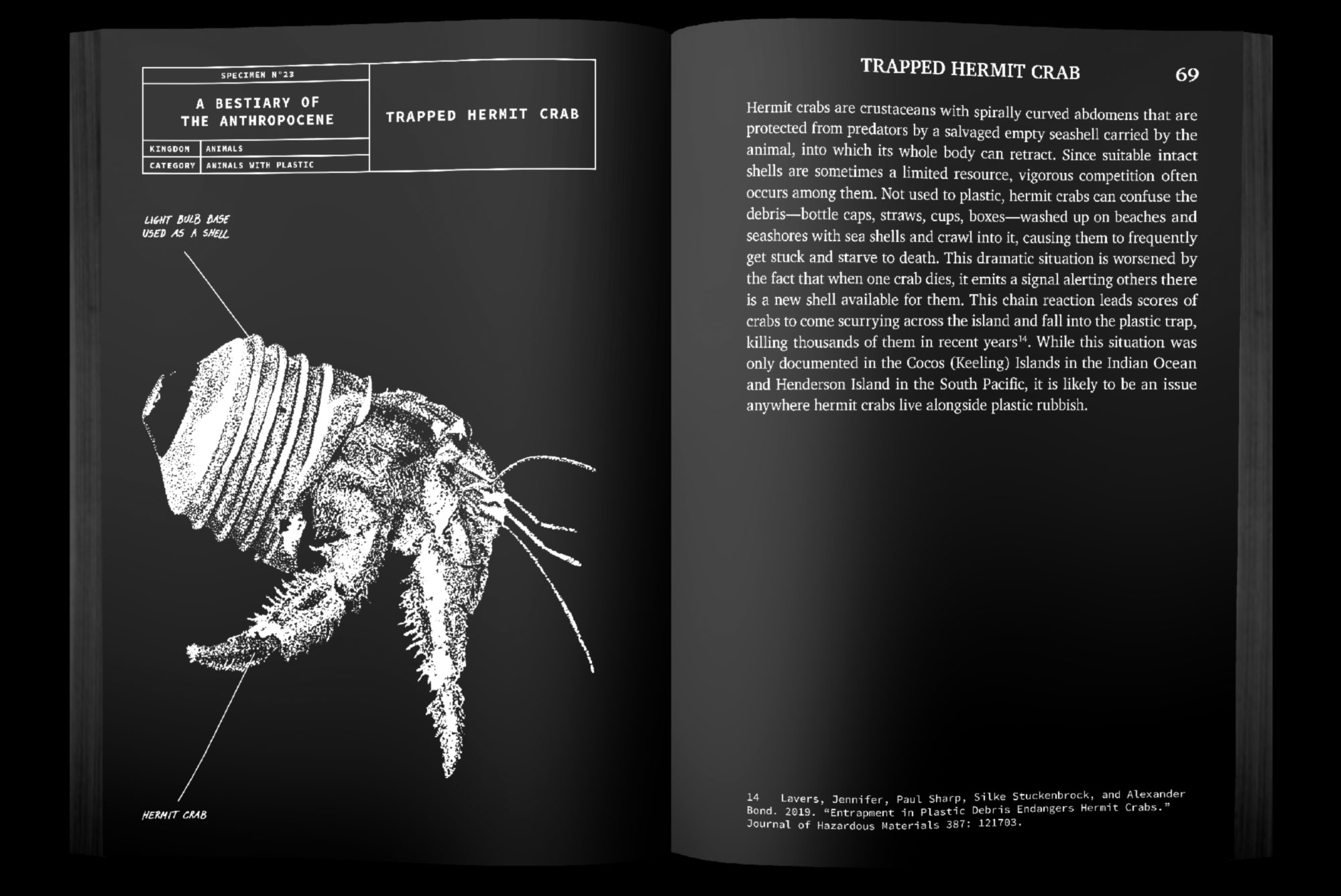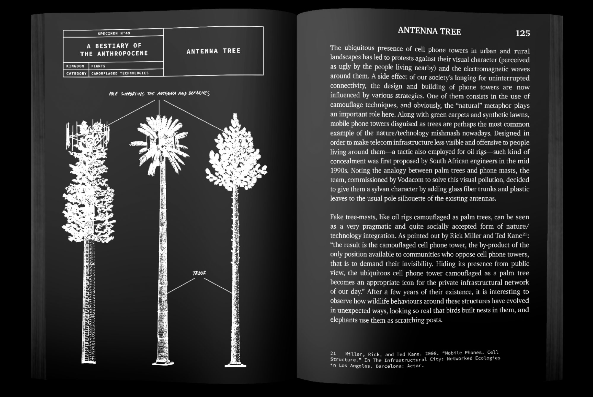 A BESTIARY OF THE ANTHROPOCENE is an illustrated compilation of hybrid creatures of our time, equally inspired by medieval bestiaries and observations of our damaged planet. Designed as a field handbook, it aims at helping us observe, navigate, and orientate into the increasingly artificial fabric of the world. Plastiglomerates, surveillance robot dogs, fordite, artificial grass, antenna trees, Sars-Covid-2, decapitated mountains, drone-fighting eagles, standardised bananas… each of these specimens are symptomatic of the rapidly transforming “post-natural” era we live in. Often without us even noticing them, these creatures exponentially spread and co-exist with us.